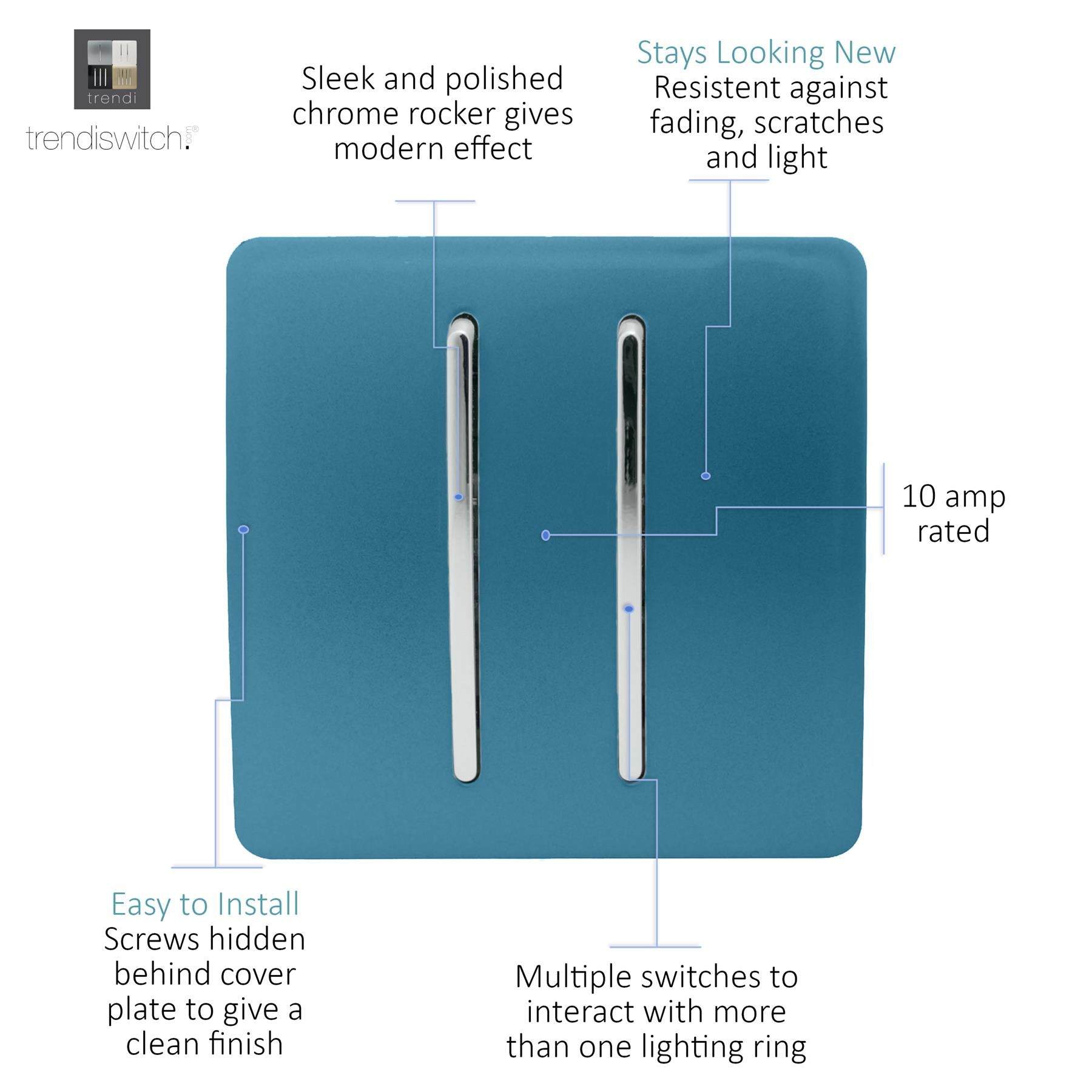 Trendi 2 Gang 3 way (Intermediate) 240V Screwless Raised Front Plate Plastic Artistic Modern Glossy 10 Amp Chrome Rocker Double Electrical Wall Light Switch in Ocean Blue