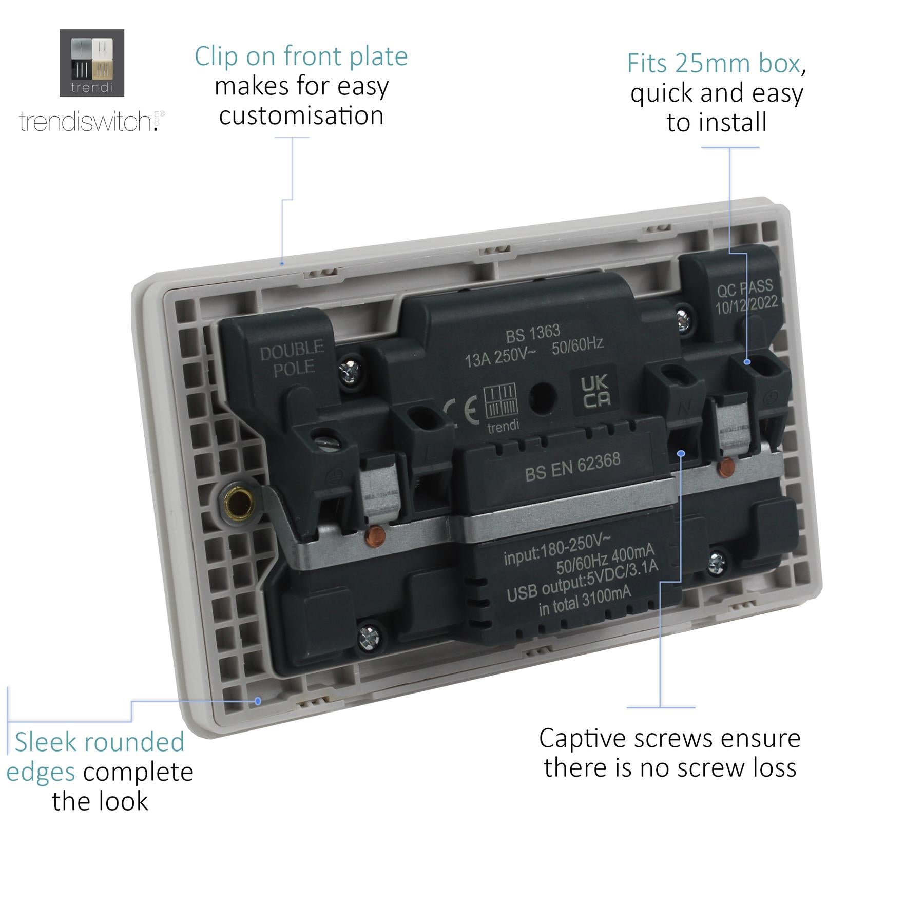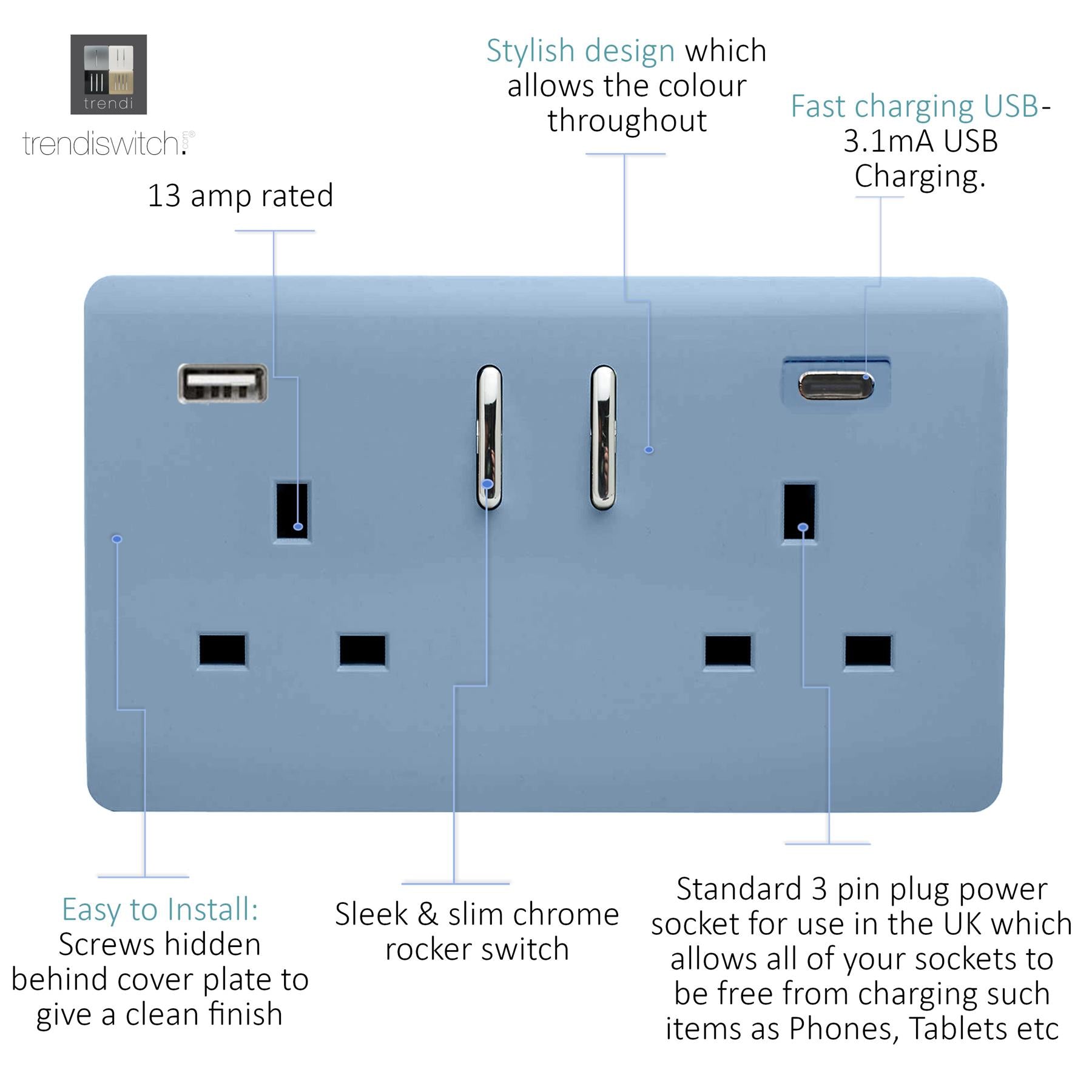 The Trendi Switch range of 2 gang modern designer 13 amp USB plug sockets comprise of a sleek chrome rocker switch on a "screwless" plate displaying the complete colour of the products. This is supported by a back frame that houses the screw holes & module for the product to be installed into compatible back boxes and wiring. This version includes 1x Type A & 1x Type C (shared) USB charging ports. The colour finish of this product is Sky Blue.