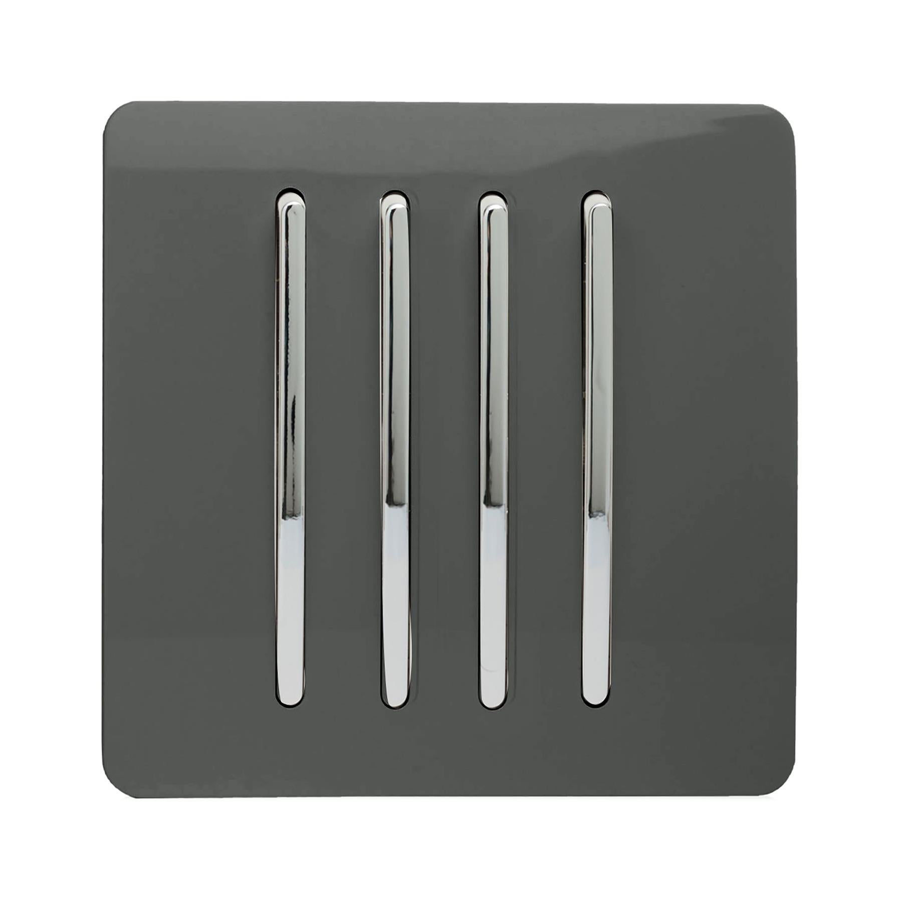 Trendi 4 Gang 2 way 240V Screwless Raised Front Plate Plastic Artistic Modern Glossy 10 Amp Chrome Rocker Quad Electrical Wall Light Switch in Charcoal Grey