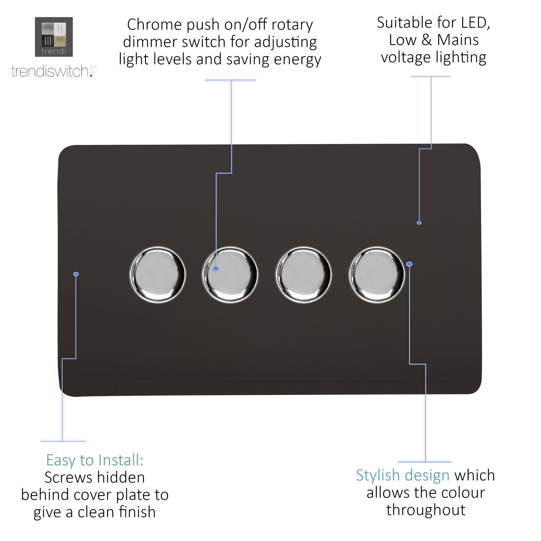 The Trendi Switch range of 4 gang 1 or 2 way 150 watt LED rotary dimmer light switches comprise of a chrome dimming knob on a "screwless" plate displaying the complete colour of the products. This is supported by a back frame that houses the screw holes & module for the product to be installed into compatible back boxes and wiring. This version has 150 watt per module.