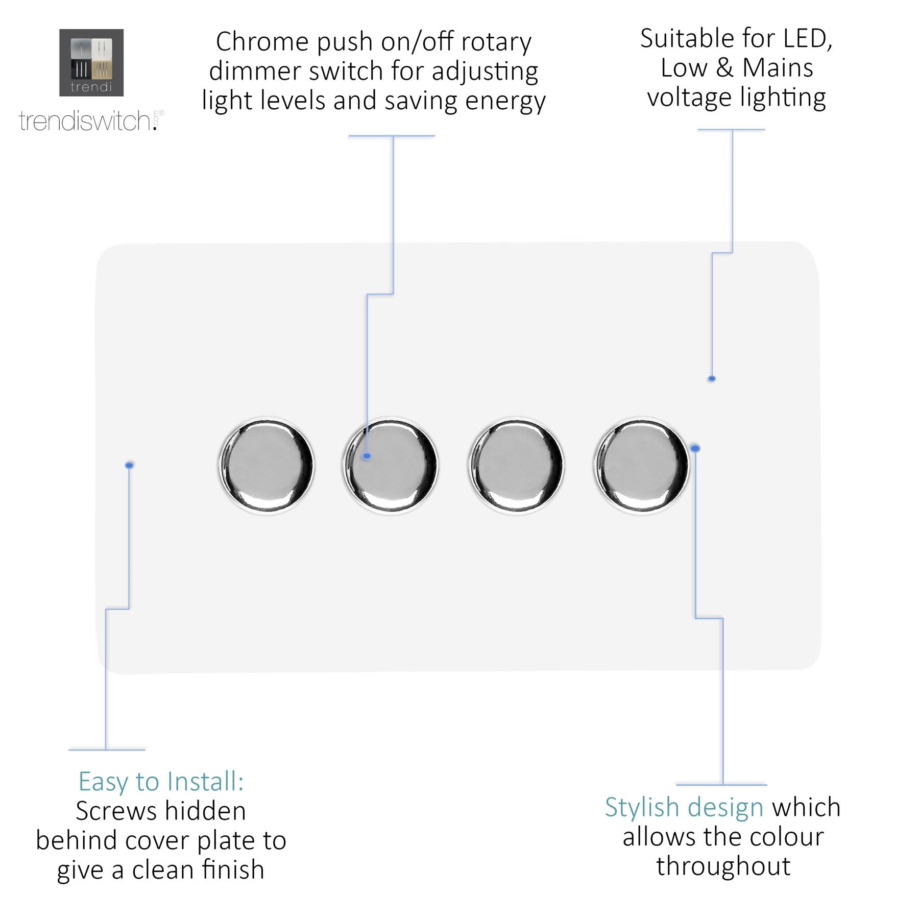 The Trendi Switch range of 4 gang 1 or 2 way 150 watt LED rotary dimmer light switches comprise of a chrome dimming knob on a "screwless" plate displaying the complete colour of the products. This is supported by a back frame that houses the screw holes & module for the product to be installed into compatible back boxes and wiring. This version has 150 watt per module.