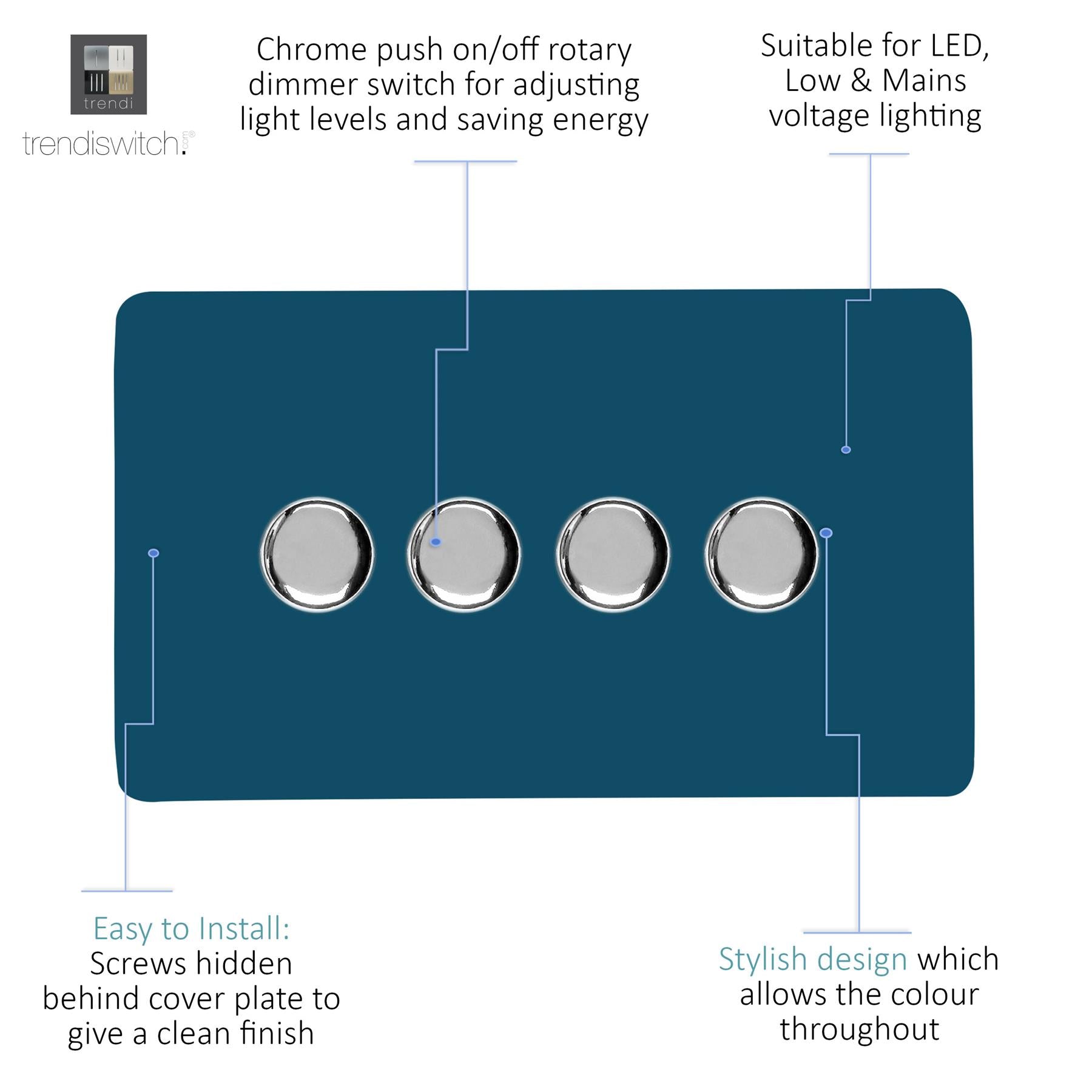 The Trendi Switch range of 4 gang 1 or 2 way 150 watt LED rotary dimmer light switches comprise of a chrome dimming knob on a "screwless" plate displaying the complete colour of the products. This is supported by a back frame that houses the screw holes & module for the product to be installed into compatible back boxes and wiring. This version has 150 watt per module.