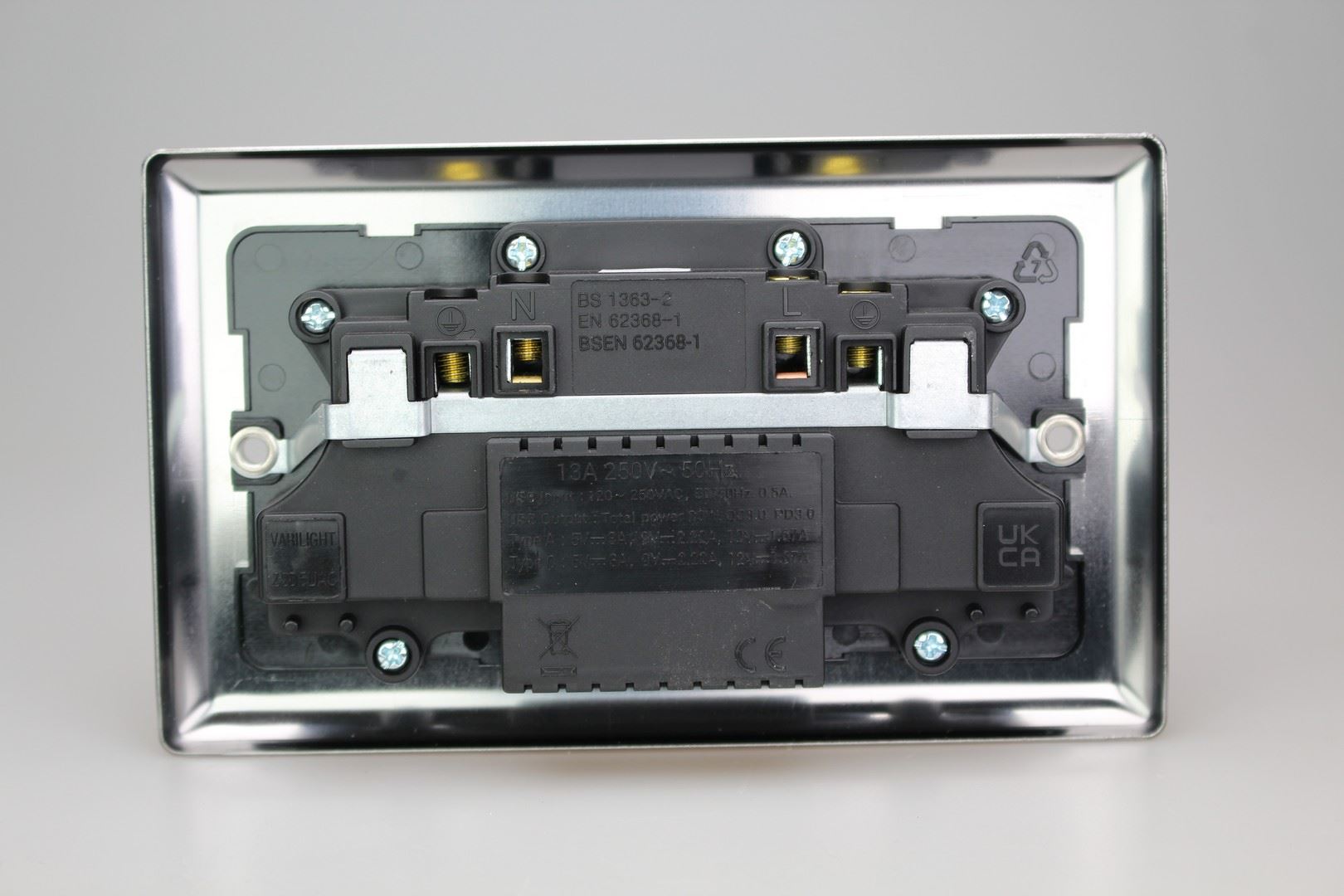 Varilight 2-Gang 13A Single Pole Switched Socket with 1x USB A & 1x USB C Charging Ports in Classic Matt Chrome w/ Steel/Black Insert